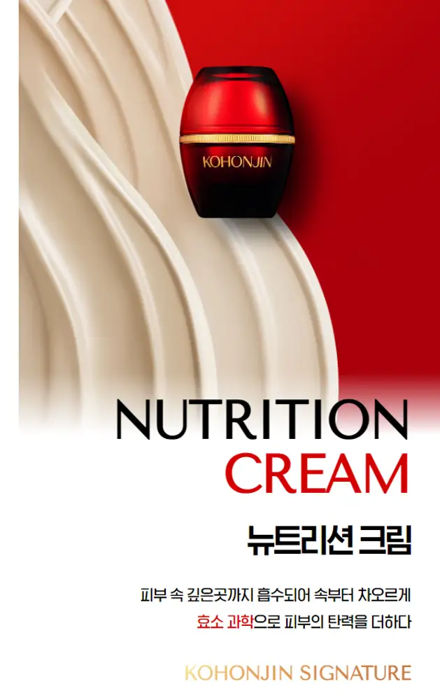 - 뉴트리션 크림: 이것은 고혼진 화장품의 주력 제품이며, 주 성분인 Rg3와 Compound-K가 함유되어 피부 속까지 영양을 공급하는 크림입니다. 대략적인 가격은 35만원입니다.