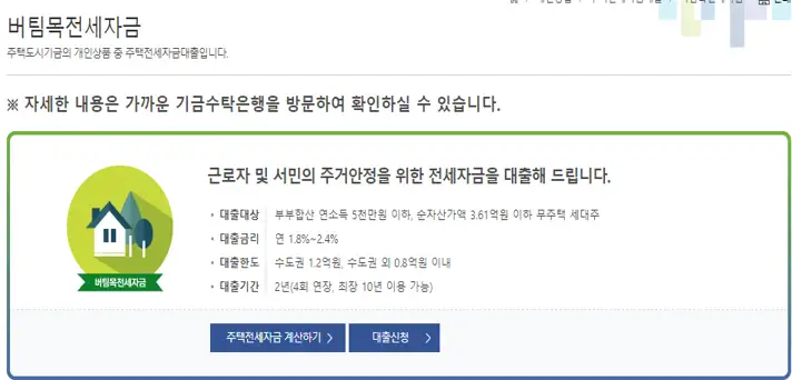 주택도시기금에서 제공하는 개인대출 상품 중 하나인 '주택전세자금대출' 중 버팀목 전세자금대출 금리 및 한도 등 조건내용에 대해 알아보겠습니다. 정부정책상품인 만큼 소득제한 자산제한이 있지만 요건만 충족된다면 시중은행의 전세자금대출 상품 보다 낮은 저금리로 진행이 가능합니다.