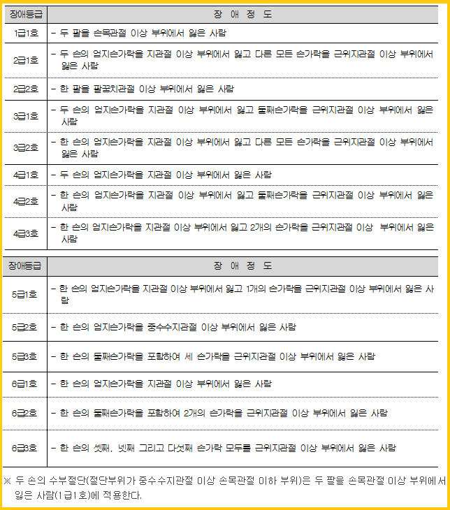 제일 높은 등급은 두 팔을 손목관절 이상 부위에서 잃은 경우이며 부상 부위에 따라 6급 3호 까지 장애등급이 정해지고 있습니다.