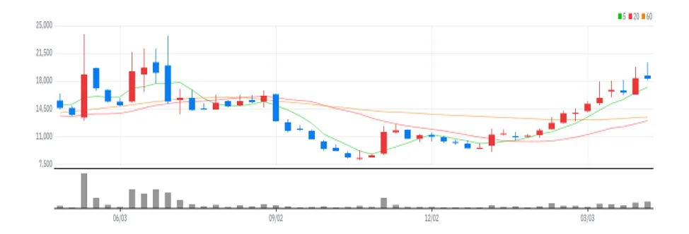 현재 일봉상 이평선 정배열 상태로 현재 종가가 10일선 20일선 사이입니다 밑으로 단기지지선 20일선(가격17806) 및 60일선(가격14597)이 있습니다